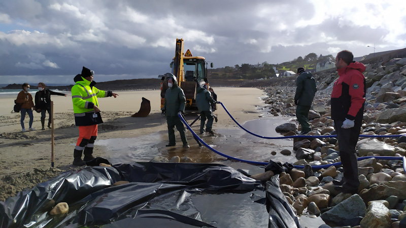 Animée par des agents du CEDRE et du Pôle National d'Expertises basés à Brest, elle a mobilisé de gros moyens en matériel pour la mise en place d'ateliers de nettoyage de sable, de galets et d'enrochements.